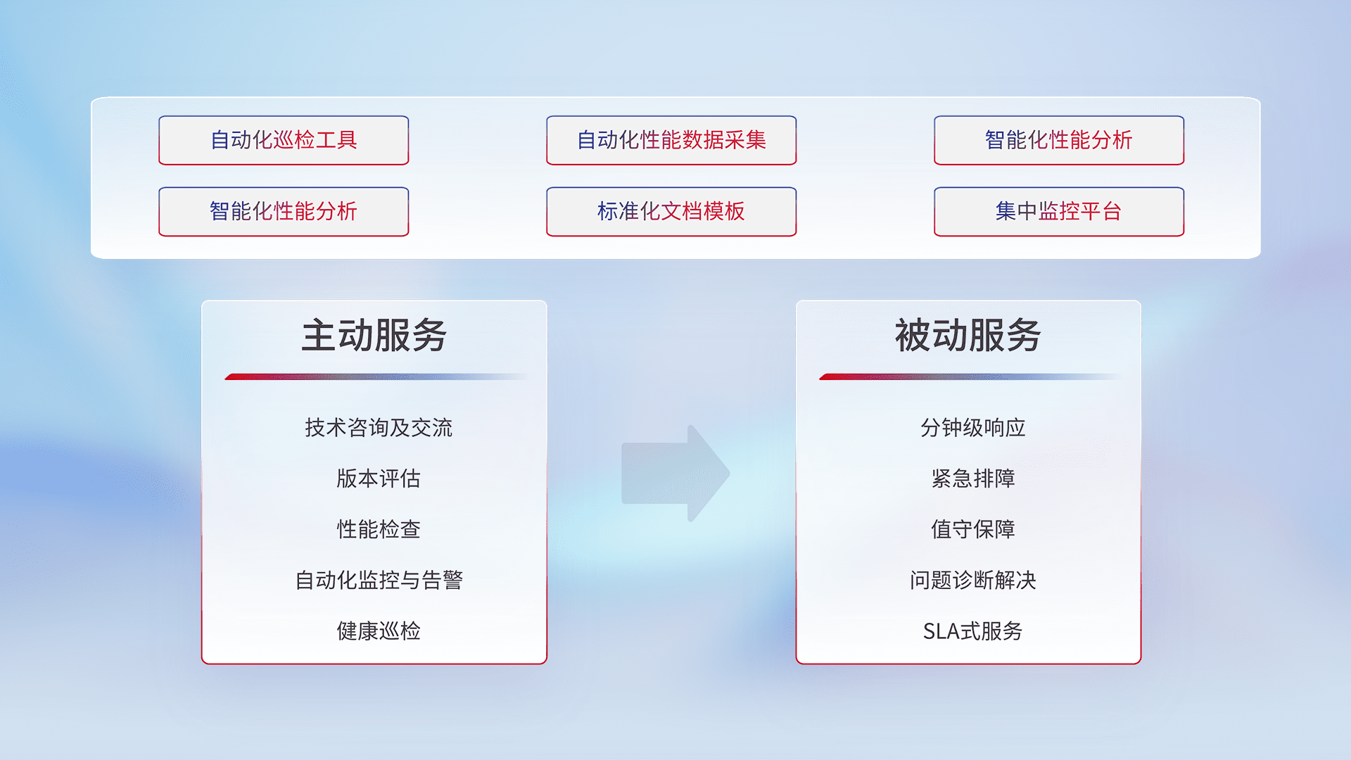 智能化工具和标准化文档,,,,保障服务质量,,提供主动服务(包含技术咨询、、、、版本评估、、性能检查、、、、自动化监控与告警、、、健康巡检)和被动服务包含(分钟级响应、、、、紧急排障、、、值守保障、、问题诊断解决、、SLA服务)。。